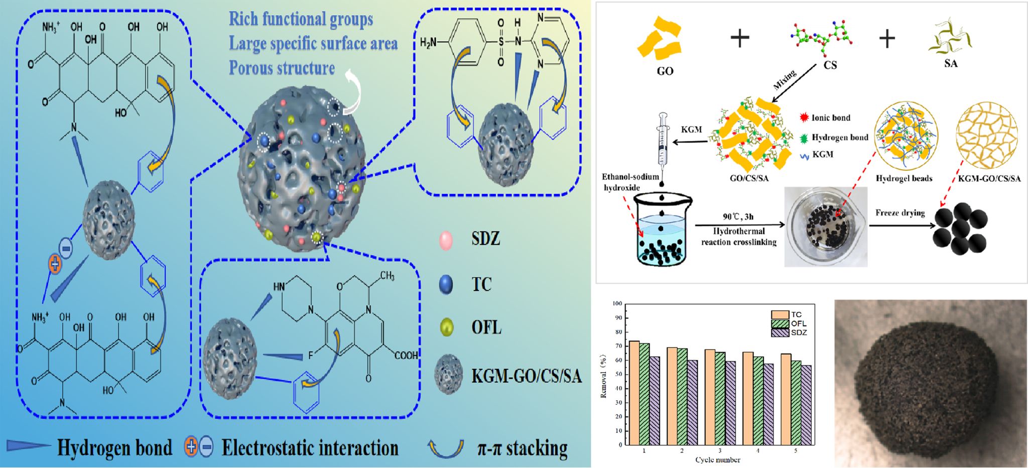 本論文的創(chuàng)新之處在于開發(fā)了一種新型魔芋葡甘聚糖(KGM)-氧化石墨烯(GO)/殼聚糖(CS)/海藻酸鈉(SA)復合氣凝膠球,采用KGM作為交聯(lián)劑,用簡單的溶膠-凝膠和滴落法制備。這種氣凝膠在抗生素水體污染治理中表現(xiàn)出極高的吸附效率和快速的吸附動力學,尤其是對四環(huán)素、氧氟沙星和磺胺嘧啶的吸附效率高且可再生循環(huán)使用,在污水處理中有較好應用前景。
