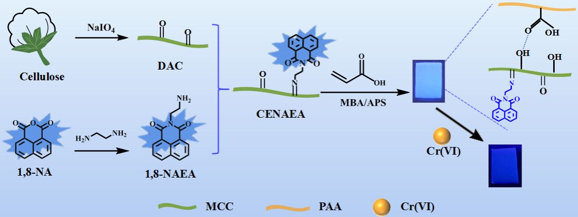 本論文的創(chuàng)新之處在于開發(fā)了一種基于1,8-萘酰亞胺改性纖維素的復合熒光水凝膠(CENAEA/PAA),這種材料不僅能高效且選擇性地檢測和吸附Cr(VI),而且具有0.58 μmol/L的低檢測限和189.04 mg/g的高吸附容量。其熒光猝滅行為與偽二級模型和Freundlich模型的良好擬合,其在重金屬離子檢測與環(huán)境修復中具有很好的應用前景。