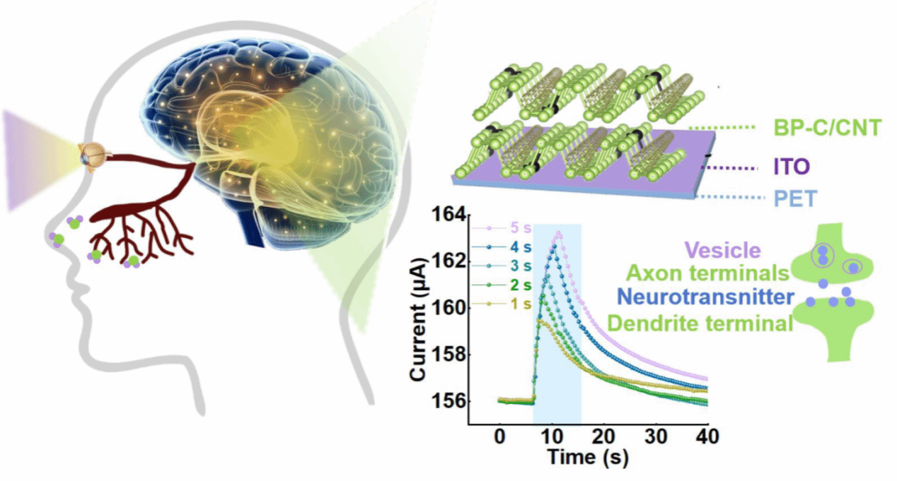 近期,物理與信息科學(xué)學(xué)院材料原子分子科學(xué)研究所許并社領(lǐng)導(dǎo)的認(rèn)知材料團(tuán)隊(duì)尉國棟教授小組青年教師王盼在著名國際學(xué)術(shù)期刊《Advanced Science》上發(fā)表題為“Highly Promising 2D/1D BP-C/CNT Bionic Opto-Olfactory Co-Sensory Artificial Synapses for Multisensory Integration”的高水平論文。我校碩士研究生董李艷為第一作者,研究生薛寶靜為共同第一作者,尉國棟和王盼為共同通訊作者,陜西科技大學(xué)為唯一通訊單位。在這項(xiàng)研究中,該團(tuán)隊(duì)研究人員開發(fā)了基于BP-C/CNTs (2D/1D)異質(zhì)結(jié)構(gòu)濾膜的仿生光嗅覺共感人工突觸器件,集成了光調(diào)制、氣體檢測和生物突觸功能,模擬了多感覺神經(jīng)元特征。這項(xiàng)工作為研究多重感知人工突觸器件提供了一種新方法。該成果的發(fā)表體現(xiàn)了我校在黑磷多重感知人工突觸器件領(lǐng)域的影響力。