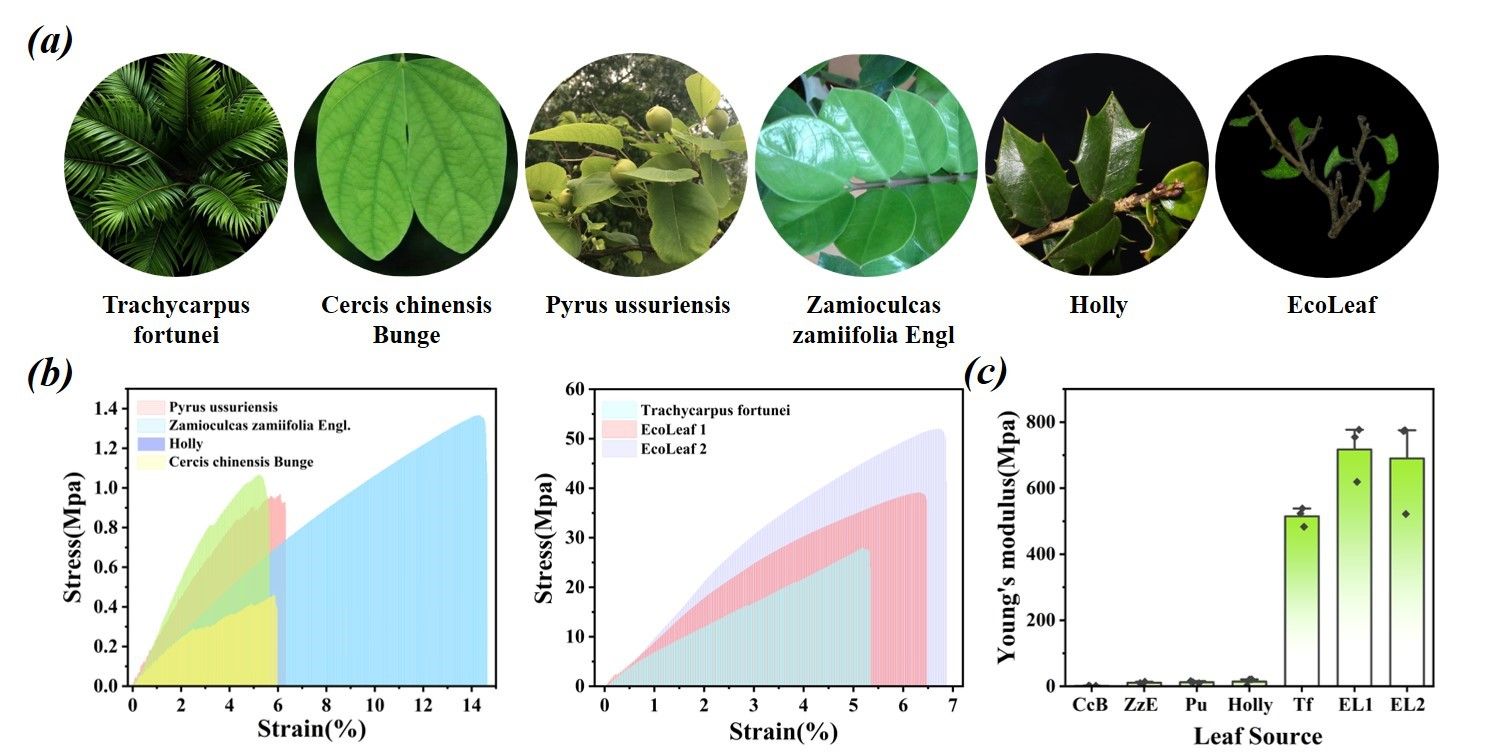 開發(fā)人工樹葉處理環(huán)境超載的CO2對于碳中和意義重大。近期,陜西科技大學輕工學院生物質(zhì)與功能材料研究所(王學川教授團隊)與纖維新材料及廢棄物資源化利用團隊(張素風教授團隊)成員合作,制備了一種迄今為止最接近自然葉片的EcoLeaf。具體而言,該葉片以紙為基材,利用活性自由基聚合技術(shù)在其表面接枝構(gòu)筑光響應聚合物涂層,與此同時將光合作用的關(guān)鍵固碳酶—碳酸酐酶原位包埋在其中(圖1)。在可見光照射下,光響應性交聯(lián)涂層結(jié)構(gòu)發(fā)生變化,從而實現(xiàn)交聯(lián)網(wǎng)孔(仿葉片氣孔)的可控開合,進而實現(xiàn)載酶葉片對空氣中CO2固碳速率的調(diào)節(jié)(圖2-圖3)。此外,該Ecoleaf具有與天然葉片相似的機械性能(圖4),并可順利地參與生態(tài)系統(tǒng)降解與養(yǎng)分循環(huán)過程,實現(xiàn)“化作春泥更護花”的美好理想(圖5)。Ecoleaf中的固碳途徑具有較為靈活的可設計性,未來可為其它生物固碳途徑提供仿生的多功能平臺。該工作以“Arti?cial cellulosic leaf with adjustable enzymatic CO2 sequestration capability”為題發(fā)表在《Nature Communications》上(Nat Commun, 2024, 15(1): 4898)。陜西科技大學是本論文的唯一通訊單位,輕工學院碩士生杜晨曦為該論文的第一作者,朱興副教授與賀斌博士為該論文的共同通訊作者該研究得到國家自然科學基金委、陜西省重點研發(fā)計劃、陜西省教育廳重點項目的支持。
