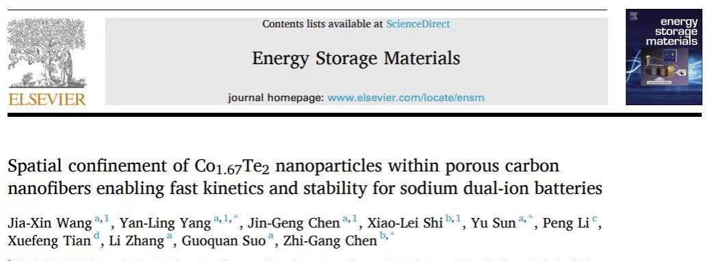 論文信息:Jia-Xin Wang, Yan-Ling Yang, Jin-Geng Chen, Xiao-Lei Shi, Yu Sun, Peng Li, Xuefeng Tian, Li Zhang, Guoquan Suo, Zhi-Gang Chen. Spatial confinement of Co1.67Te2 nanoparticles within porous carbon nanofibers enabling fast kinetics and stability for sodium dual-ion batteries, Energy Storage Materials, 71 (2024) 103578.