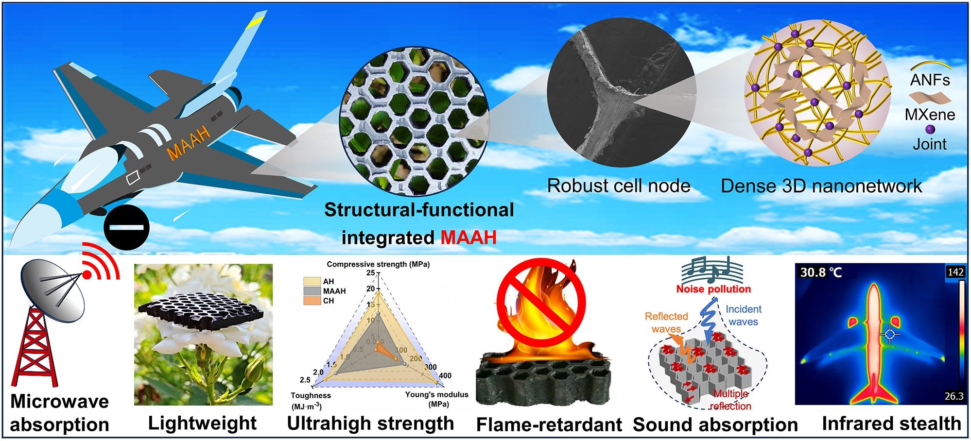 團(tuán)隊(duì)開發(fā)了一種納米雜化組裝策略制備了可擴(kuò)展、可回收、無樹脂的結(jié)構(gòu)功能一體化的芳綸蜂窩吸波(MAAH)材料。得益于芳綸納米纖維相互交織形成的一體化超強(qiáng)蜂窩節(jié)點(diǎn)設(shè)計(jì)以及致密的三維網(wǎng)絡(luò)結(jié)構(gòu),蜂窩的抗壓強(qiáng)度和韌性分別是商用芳綸蜂窩的6倍和25倍。更重要的是,MXene導(dǎo)電網(wǎng)絡(luò)與蜂窩的多孔結(jié)構(gòu)以及導(dǎo)電損耗、偶極和界面極化的協(xié)同作用使其具有優(yōu)異的吸波性能,在厚度僅為1.9 mm反射損耗最小值可以達(dá)到-38.5 dB,幾乎覆蓋了整個X波段。此外,MAAH還具有出色的紅外熱隱身、吸音性能和結(jié)構(gòu)完整性的實(shí)時監(jiān)測功能,在航空航天和軍事民用等領(lǐng)域具有廣闊的應(yīng)用前景。該研究“Functional-Structural Integrated Aramid Nanofiber?based Honeycomb Materials with Ultrahigh Strength and Multi?Functionalities”發(fā)表在Advanced Fiber Materials》上。博士研究生孫浩為本文第一作者,楊斌副教授、張美云教授為通訊作者。