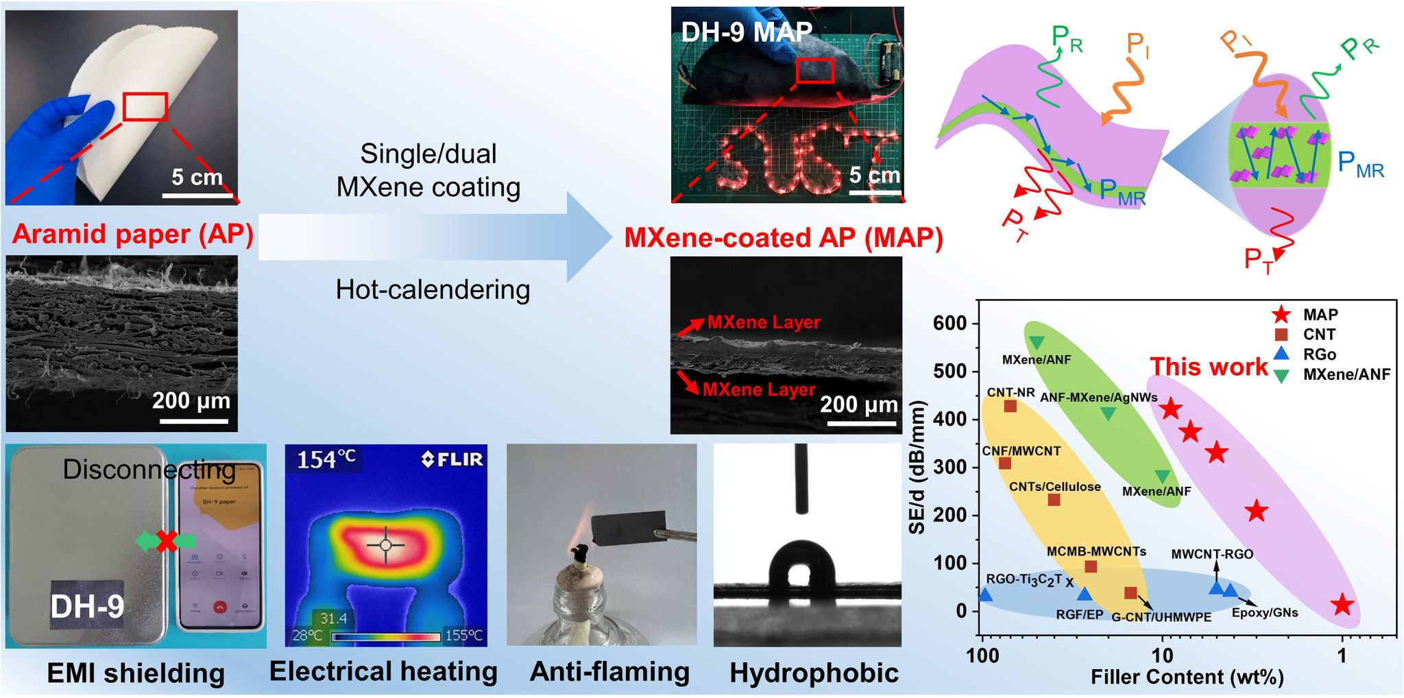 針對不良電磁干擾對高精度電子設(shè)備的性能、信息安全和人類健康造成的不利影響,在芳綸紙表面選擇性地單層/雙層涂覆 MXene涂層,制備了一種具有高效電磁屏蔽和優(yōu)異電熱性能的柔性紙基功能材料。在較低的導(dǎo)電填料添加量下(9.0 wt%)電磁屏蔽紙表現(xiàn)出優(yōu)異EMI屏蔽效能,即使在經(jīng)歷 5000 次反復(fù)彎曲循環(huán)后也仍保留了較佳的屏蔽效能。此外,復(fù)合紙還具有出色焦耳電加熱能力(在5 V的低驅(qū)動電壓下,電熱溫度達(dá)到 150 °C)和出色的阻燃性。研究成果以“Mechanically Strong, Flexible, And Flame-Retardant Ti3C2Tx MXene-Coated Aramid Paper with Superior Electromagnetic Interference Shielding and Electrical Heating Performance”發(fā)表在《Chemical Engineering Journal》上。碩士研究生汪浩然為本研究的主要完成人,楊斌副教授、陸趙情教授為通訊作者。