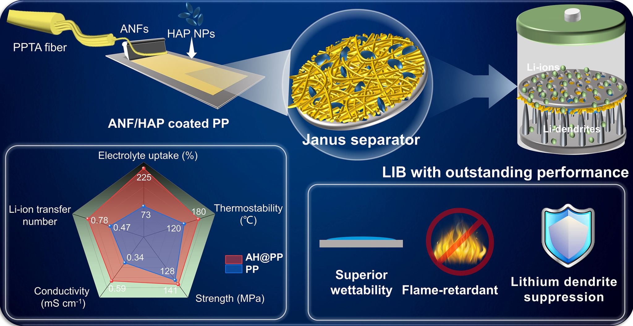 針對目前商業(yè)化的聚烯烴隔膜存在的熱穩(wěn)定性差、潤濕性低、易被鋰枝晶刺穿等問題,導(dǎo)致鋰電池易發(fā)生熱失控和短路等安全隱患問題,利用芳綸納米纖維和羥基磷灰石納米顆粒作為主要構(gòu)筑單元,在聚烯烴隔膜表面涂覆三維納米網(wǎng)絡(luò)保護(hù)層,制備了一種具有高強(qiáng)度、高模量、納米孔隙結(jié)構(gòu)的Janus隔膜(AH@PP)。復(fù)合隔膜具有優(yōu)異的熱穩(wěn)定性,保持著較高的鋰離子傳輸效率和電化學(xué)表現(xiàn)能力,同時,具有高模量和納米級孔隙結(jié)構(gòu)的涂層能夠有效抵御鋰枝晶的穿刺,在軟包電池中的成功應(yīng)用也證明了其應(yīng)用的普適性。該研究“Janus separator with high-temperature resistance and dendrite suppression for advanced Li-ions batteries”發(fā)表在Journal of Power Sources上。碩士研究生龐瑞雪是論文的主要完成人,楊斌副教授、張美云教授為通訊作者。