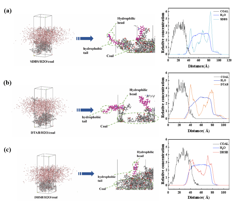 如圖1(a)SDBS(陰離子):疏水尾鏈向煤表面聚集,親水頭部向水相延伸,與煤表面密度曲線部分重疊,表明吸附作用顯著;(b)DTAB(陽(yáng)離子):頭部正電荷與煤表面負(fù)電荷位點(diǎn)結(jié)合,密度峰值靠近煤表面,尾部伸入水相,形成疏水層;(c)DHSB(兩性):陰、陽(yáng)離子基團(tuán)協(xié)同吸附,密度分布范圍更廣,體現(xiàn)廣譜煤階適配性。( 詳見DOI: 10.1016/j.colsurfa.2025.136276 )