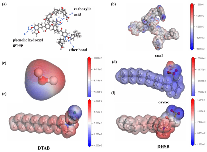 圖2 (a)煤炭棒狀模型,(b)煤炭表面電勢(shì)分布,(c)水分子,(d)SDBS,(e)DTAB,(f)DHSB表面活性劑。