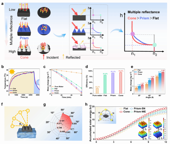 圖5:三維錐形陣列設(shè)計(jì)及太陽(yáng)能蒸發(fā)性能測(cè)試