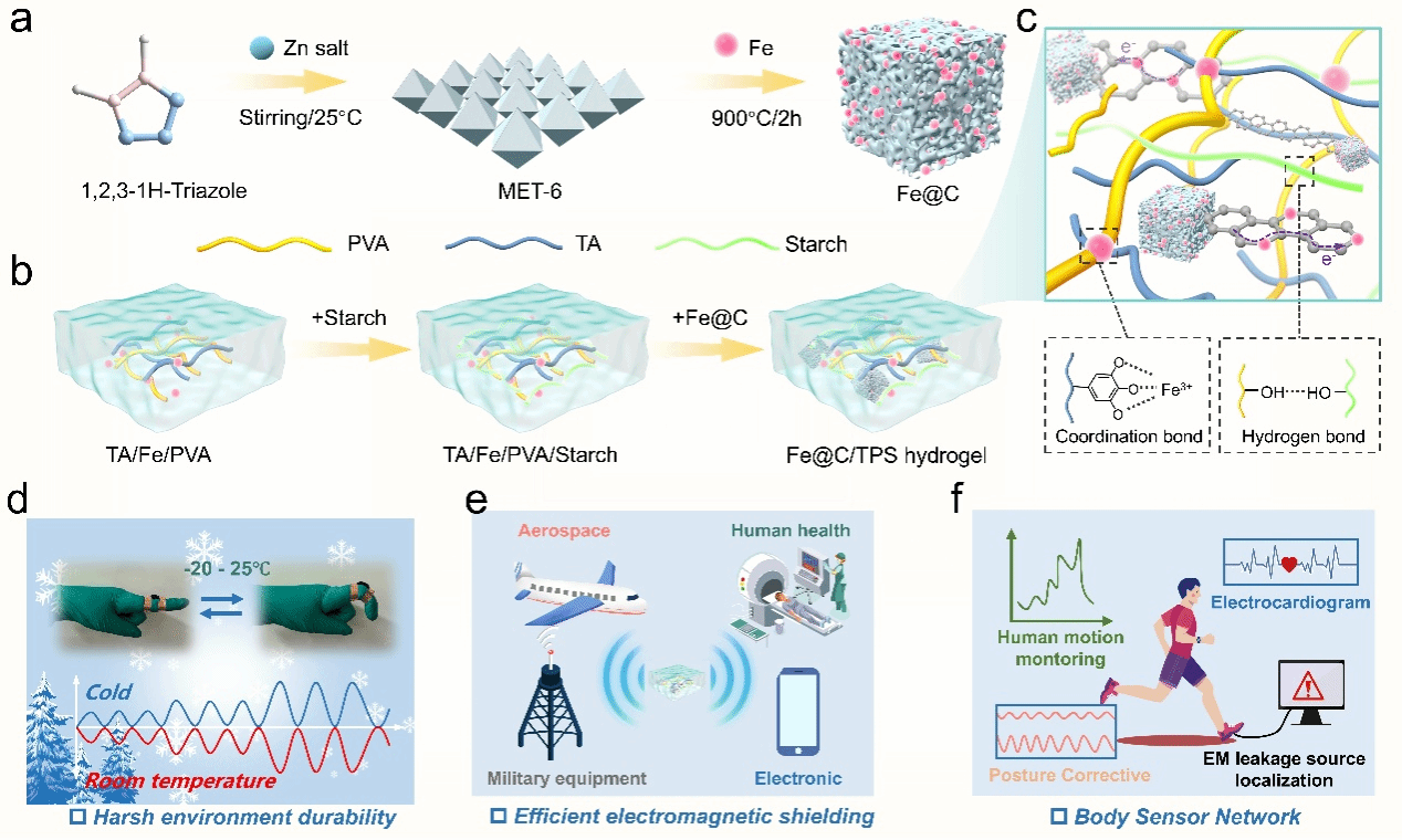 圖1. Fe@C/TPS復(fù)合水凝膠的制備流程與多功能機制示意圖
