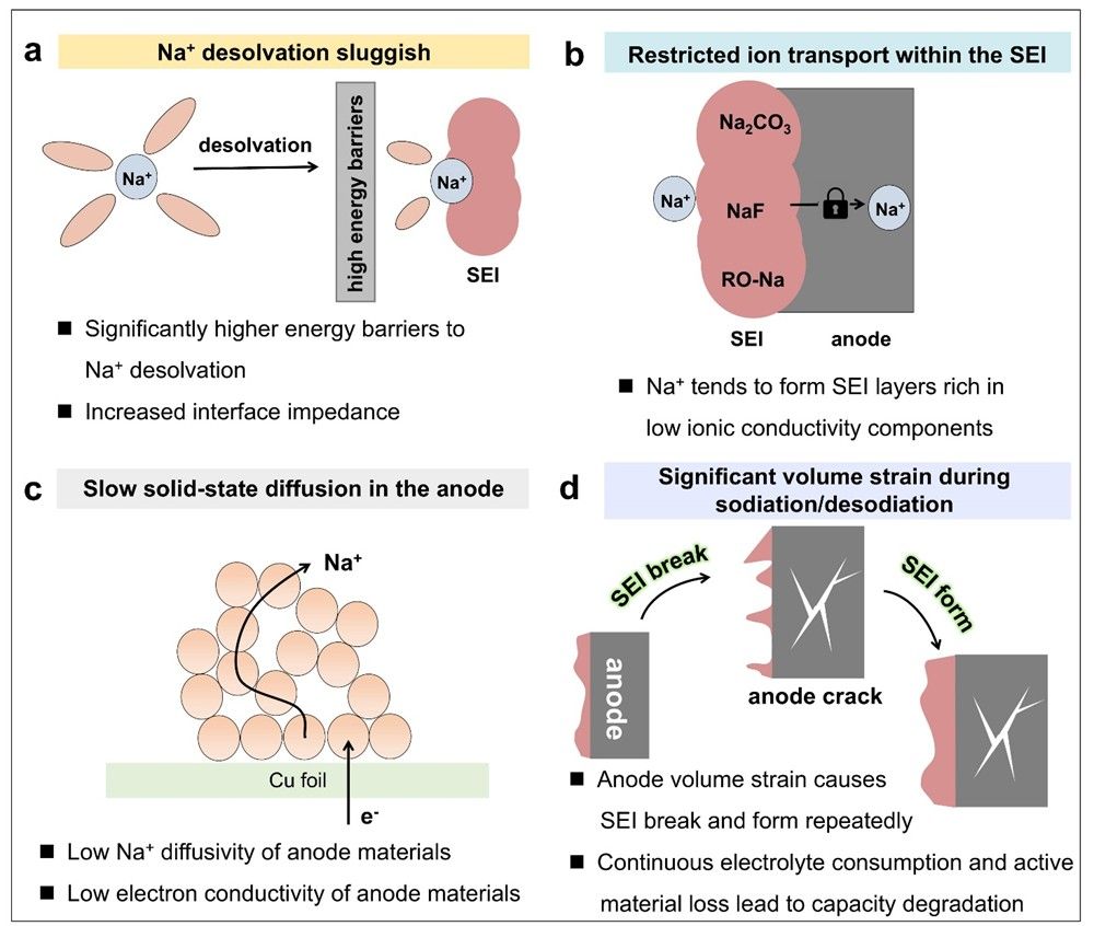 鈉離子電池作為下一代儲(chǔ)能器件,因其潛在的成本優(yōu)勢(shì)和快充能力,受到了廣泛關(guān)注。然而,要實(shí)現(xiàn)超快充(充電時(shí)間小于15分鐘)以滿足實(shí)際應(yīng)用需求,仍然面臨著諸多挑戰(zhàn)。在鈉離子電池中,負(fù)極的動(dòng)力學(xué)行為是決定其快充性能的絕對(duì)核心。因此,為了實(shí)現(xiàn)快速充電電池的大規(guī)模商業(yè)化,近年來學(xué)界投入了大量精力以開發(fā)具有優(yōu)異倍率性能的先進(jìn)負(fù)極材料。然而,從Na+遷移全過程的動(dòng)力學(xué)限制出發(fā),系統(tǒng)總結(jié)負(fù)極材料快充關(guān)鍵瓶頸,并總結(jié)其應(yīng)對(duì)策略的綜述仍較為稀缺。