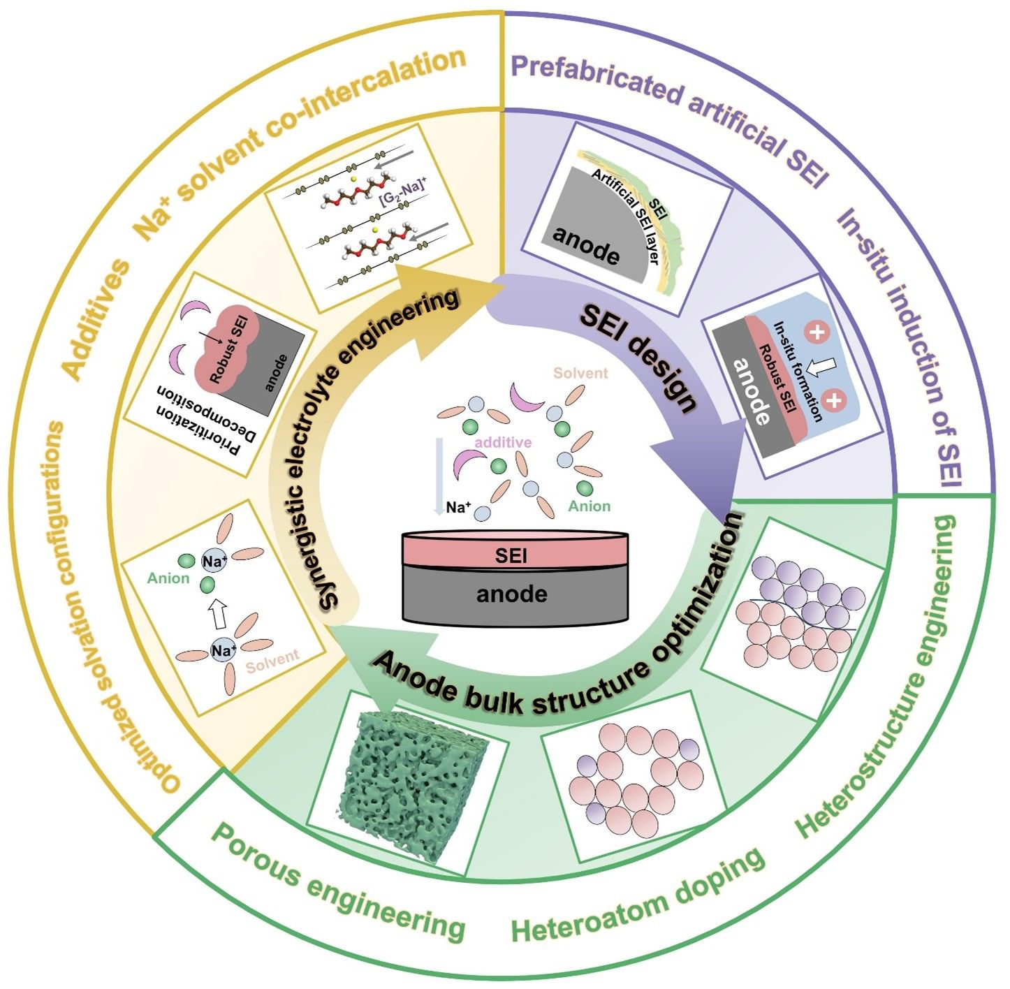本論文從Na+遷移的動(dòng)力學(xué)過程出發(fā),分析了鈉離子電池負(fù)極面臨的核心挑戰(zhàn),主要集中在以下四個(gè)方面:(1)Na+脫溶劑化過程的緩慢;(2)SEI層內(nèi)部離子傳輸?shù)氖芟蓿唬?)負(fù)極內(nèi)部固態(tài)擴(kuò)散的緩慢;(4)鈉化/脫鈉過程中的顯著體積變化。基于此,本論文構(gòu)建了一套以機(jī)制為導(dǎo)向、策略相匹配的綜述框架。圍繞體相結(jié)構(gòu)優(yōu)化、協(xié)同電解液工程以及合理SEI設(shè)計(jì)三個(gè)方面,系統(tǒng)總結(jié)了近年來的代表性研究進(jìn)展,力求為高性能鈉離子電池快充負(fù)極的設(shè)計(jì)提供更具針對(duì)性的理論支撐與實(shí)踐參考。最后,對(duì)未來鈉離子電池快充負(fù)極材料的發(fā)展方向、面臨的主要挑戰(zhàn)進(jìn)行了展望,并提出了相應(yīng)的解決策略。