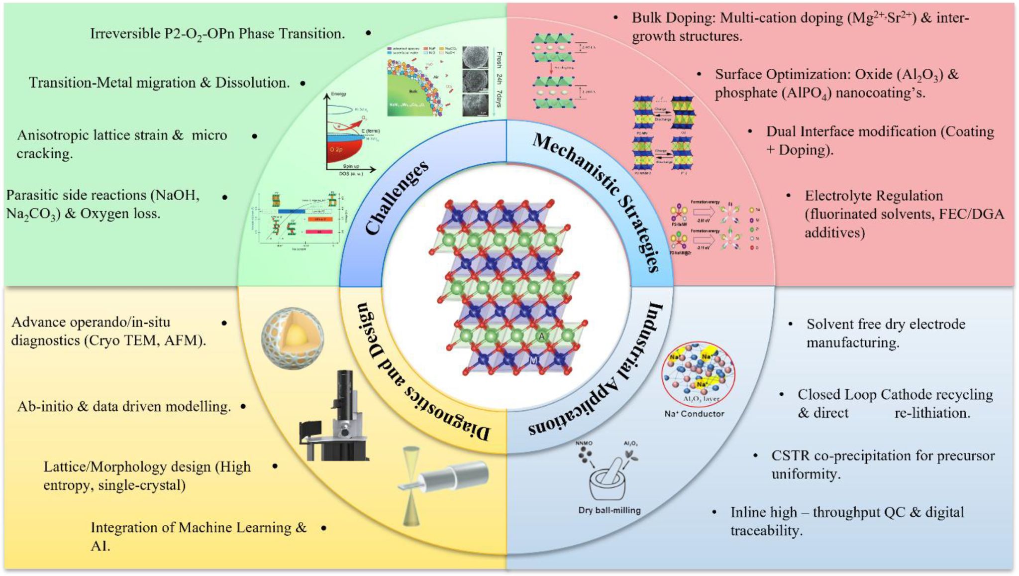 在這篇綜述中,作者對鈉離子電池層狀過渡金屬氧化物正極的界面及結(jié)構(gòu)調(diào)控策略進行了系統(tǒng)性的綜述。作者首先深入剖析了導(dǎo)致層狀氧化物性能衰減的核心機制,包括由層間滑移引起的不可逆相變、高電壓下的陰離子氧化還原導(dǎo)致的晶格氧釋放、過渡金屬離子的溶解與遷移,以及電解液在高活性表面的分解與副反應(yīng)。