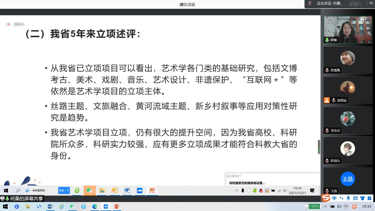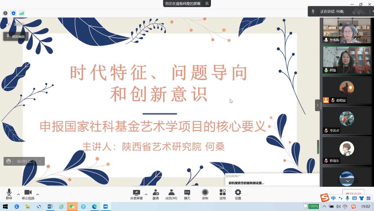 12月23日晚,應(yīng)設(shè)計(jì)與藝術(shù)學(xué)院與科技處邀請,陜西省藝術(shù)研究院副院長何桑教授云端做客我?!扒把乜茖W(xué)報(bào)告”,作了題為“時代特征、問題導(dǎo)向和創(chuàng)新意識——申報(bào)國家社科基金藝術(shù)學(xué)項(xiàng)目的核心要義”的學(xué)術(shù)報(bào)告。報(bào)告會由設(shè)藝學(xué)院副院長賀雪梅主持,學(xué)院全體教師及部分研究生聆聽了此次精彩分享。