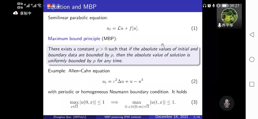 12月14日上午,應數(shù)學與數(shù)據(jù)科學學院邀請,香港理工大學喬中華教授做客我?!扒把乜茖W報告”,通過騰訊會議作了題為“Maximum bound principle preserving integrating factor Runge-Kutta methods for semilinear parabolic equations”的線上報告。報告會由數(shù)學學院副院長李劍教授主持,學院相關(guān)專業(yè)教師和研究生參加了報告會。