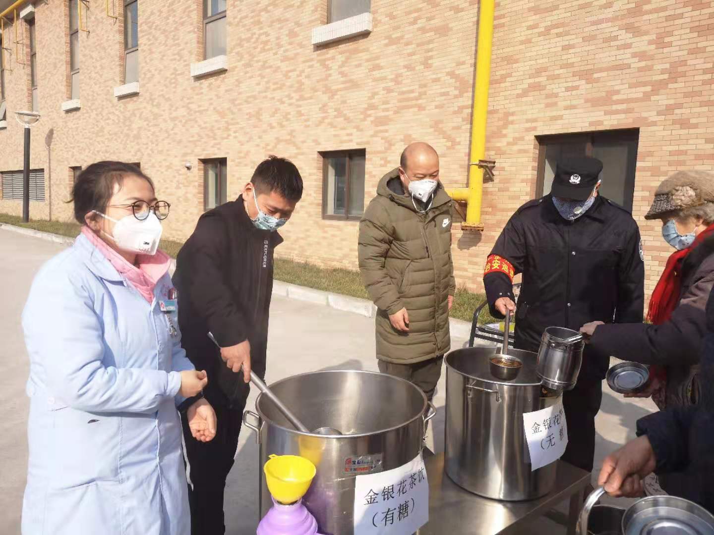 大年初二,后勤戰(zhàn)線上的疫情防控工作就全面鋪開,后勤黨總支委員、校醫(yī)院負責人劉強多方奔走,采購口罩、消毒水等醫(yī)療衛(wèi)生用品,通過不懈努力,采購到600余包口罩、500公斤過氧乙酸消毒水,有力保障了校園消毒使用。大年初三,后勤黨總支三支部書記、校醫(yī)院院長樊虎杰從省疾控中心獲得可以有效預防病毒感染的金銀花茶飲中藥飲片配方,立即聯(lián)絡飲食服務中心黨支部書記梁本立一起著手采購飲片,張征、張海東等幾位師傅著手熬制,為了照顧各類教職工人群的需求,他們還細心地準備了有糖、無糖兩種口味,通過一整天的準備工作,大年初四一大早,他們就將熬好的金銀花茶飲在沁園小區(qū)的三個分發(fā)點派送給教職工群眾,熱氣騰騰的茶飲受到大家的歡迎和好評,一邊熬制,一遍派發(fā),餐廳后廚的4口大鍋不斷沸騰著,兩天時間連續(xù)熬制了12鍋金銀花茶飲,溫暖了全體教職工的心。
