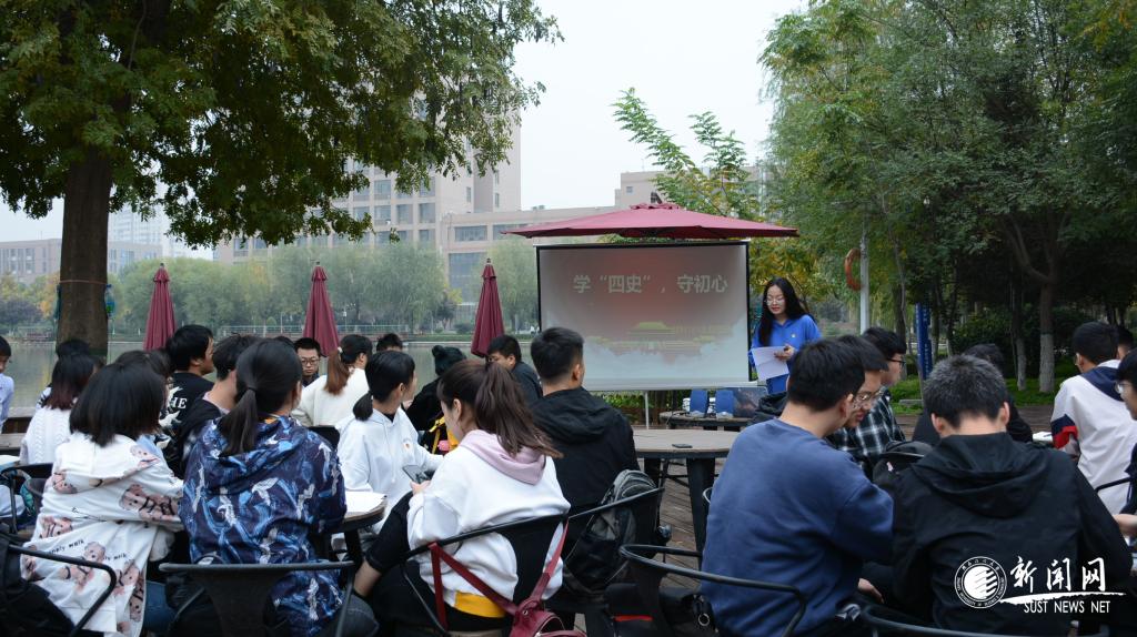 “我們?yōu)槭裁匆獙W(xué)‘四史’?”微風(fēng)徐徐,湖水蕩漾,黑天鵝們悠然的在水中嘻戲,30多個(gè)青年學(xué)子圍坐在科大湖西岸1958學(xué)術(shù)廣場(chǎng),一堂圍繞“四史”教育開(kāi)展的“黨味”濃厚、“鮮味”十足、“情懷”至真的主題團(tuán)日活動(dòng),成為他們?cè)跐鉂獾那镆饫飳?zhuān)享的一份“精神大餐”。這是陜科大傾情打造的“第二思政課堂”—湖畔講堂與主題團(tuán)日的一次融合,依托美麗的科大湖景和天然的自然風(fēng)光,將嚴(yán)肅的思政課由室內(nèi)搬到了湖畔邊、樹(shù)蔭下。