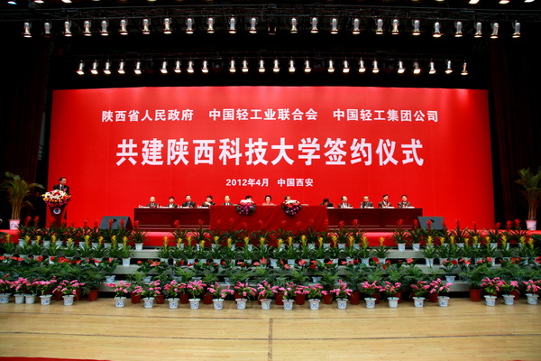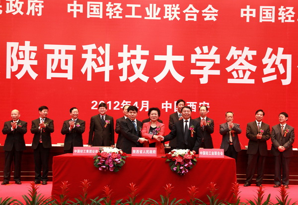 為了深入貫徹落實《國家中長期教育改革和發(fā)展規(guī)劃綱要(2010-2020年)》,大力實施科教興陜戰(zhàn)略和人才強省戰(zhàn)略,更好地保持和發(fā)揮我校輕化工為主的辦學特色和學科優(yōu)勢,全面加強校企合作,積極構建輕工行業(yè)科技攻關支撐平臺,加快推進我校高水平、有特色的教學研究型大學建設,積極爭取將我校納入“中西部高等教育振興計劃”, 4月 17日 ,“陜西省人民政府與中國輕工業(yè)聯合會、中國輕工集團公司共建陜西科技大學簽約儀式”在文體館隆重舉行。