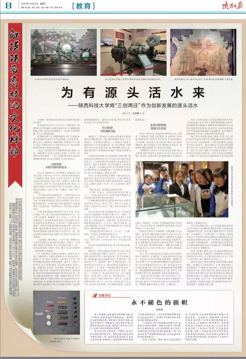 12月1日,《陜西日報》八版以《為有源頭活水來——陜西科技大學將“三創(chuàng)兩遷”作為創(chuàng)新發(fā)展的源頭活水》為題,整版報道我校西遷歷史、西遷故事和近年來取得的成績。陜西科技大學作為“西遷群體”之一,在六十多年的發(fā)展歷程中,歷經(jīng)“三次創(chuàng)業(yè)、兩次搬遷、一次劃轉(zhuǎn)”的奮斗與輝煌,秉承以“自強不息、艱苦奮斗的創(chuàng)業(yè)精神,求實創(chuàng)新、銳意進取的科學精神和扎根西部、服務社會的奉獻精神”為內(nèi)涵的“三創(chuàng)兩遷”精神,培養(yǎng)出一批勇于實踐、善于創(chuàng)新的優(yōu)秀學子,為國家建設和社會發(fā)展做出了重要貢獻。全文轉(zhuǎn)載如下: