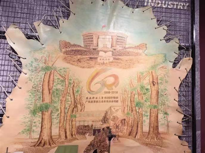 學校60周年校慶時,廣東皮革校友會捐贈的一整張牛皮上手工烙皮革畫