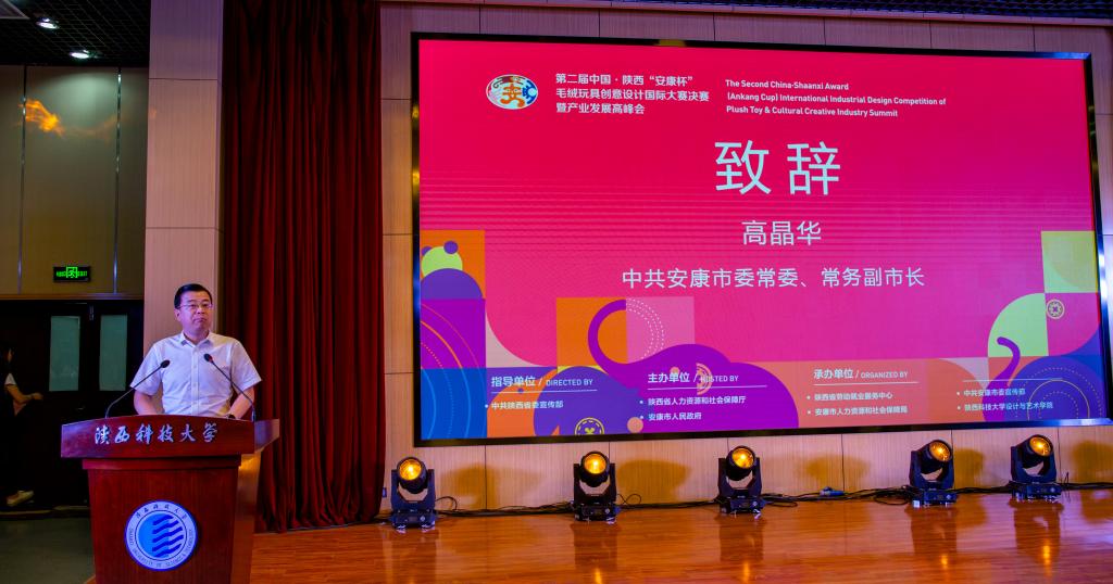 6月10日,第二屆中國(guó)·陜西“安康杯”毛絨玩具創(chuàng)意設(shè)計(jì)國(guó)際大賽決賽及頒獎(jiǎng)典禮在陜西科技大學(xué)西安校區(qū)隆重舉行。中共安康市委副書記、市長(zhǎng)趙俊民,人力資源和社會(huì)保障部職業(yè)能力建設(shè)司副司長(zhǎng)朱利民,中國(guó)玩具和嬰童用品協(xié)會(huì)會(huì)長(zhǎng)梁梅,中共陜西省委宣傳部副部長(zhǎng)柯昌萬(wàn),陜西省人力資源和社會(huì)保障廳副廳長(zhǎng)井海濱,中共陜西省委宣傳部二級(jí)巡視員雎勵(lì)軍,中共陜西省委宣傳部文產(chǎn)辦主任魯吉安,中共安康市委常委、常務(wù)副市長(zhǎng)高晶華,安康市人大常委會(huì)副主任陳倫寶,陜西科技大學(xué)黨委書記姚書志,校長(zhǎng)李志健,副校長(zhǎng)黃劍鋒,中共安康市委宣傳部常務(wù)副部長(zhǎng)周繼林,安康市人力資源和社會(huì)保障局局長(zhǎng)汪小衛(wèi)和陜西美協(xié)主席郭線廬,中國(guó)傳媒大學(xué)動(dòng)畫與數(shù)字藝術(shù)學(xué)院院長(zhǎng)黃心淵,西北工業(yè)大學(xué)工業(yè)設(shè)計(jì)研究所所長(zhǎng)余隋懷,浙江大學(xué)現(xiàn)代工業(yè)設(shè)計(jì)研究所所長(zhǎng)孫守遷,湖南大學(xué)設(shè)計(jì)藝術(shù)學(xué)院院長(zhǎng)季鐵,深圳優(yōu)泰文創(chuàng)運(yùn)營(yíng)發(fā)展有限公司董事長(zhǎng)李克克出席大賽決賽及頒獎(jiǎng)典禮。