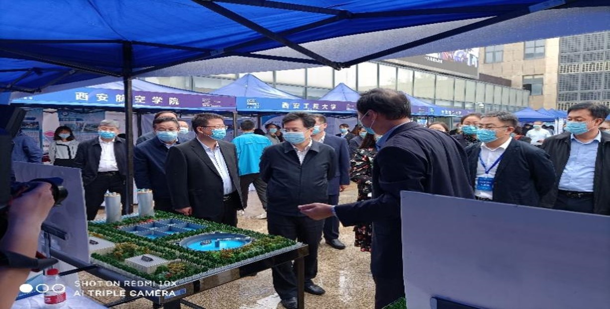 陜西省教育廳一級巡視員朱征南親臨我校展臺,張安龍為他詳細介紹了我校環(huán)境學科近年來承擔的國家級、省部級項目情況,科技成果服務地方經(jīng)濟發(fā)展情況,以及人才培養(yǎng)及就業(yè)情況等。朱征南對我校的科普及科技成果轉(zhuǎn)化工作給予了充分肯定,并希望我校進一步提高科技成果轉(zhuǎn)化的數(shù)量和質(zhì)量。