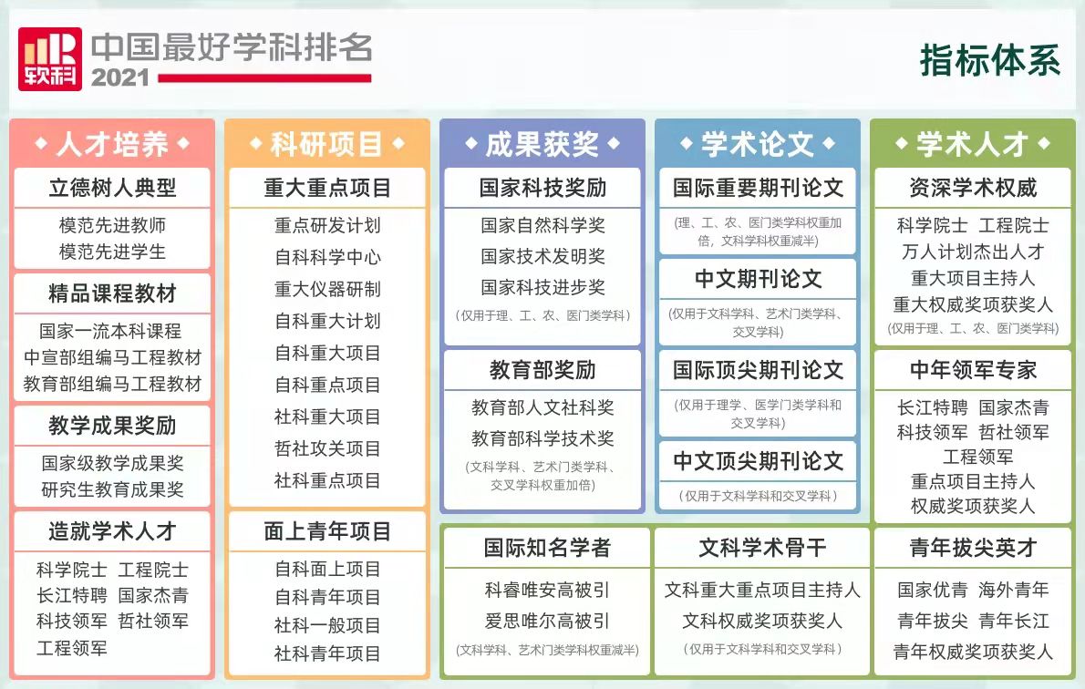 軟科“中國最好學科排名”源自服務于高校學科建設管理部門的學科發(fā)展水平動態(tài)監(jiān)測數據系統(tǒng),2017年開始計算學科綜合排名并對外公開發(fā)布。軟科中國最好學科排名的指標體系包括人才培養(yǎng)、科研項目、成果獲獎、學術論文、學術人才五個指標類別,使用50余項學科建設管理中密切關注的量化指標,強調通過客觀數據反映學科點對本學科稀缺資源和標志性成果的占有和貢獻,學科口徑是教育部最新《學位授予和人才培養(yǎng)學科目錄》中的一級學科,學科排名在不同學科采用差異化的指標體系。