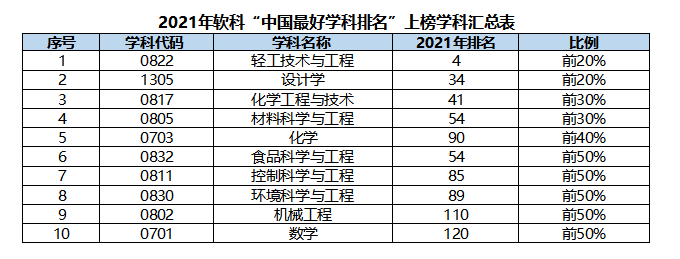 輕工技術與工程、設計學排名首次進入前20%,材料科學與工程、化學工程與技術排名前30%,化學排名前40%,數學、機械工程、控制科學與工程、環(huán)境科學與工程、食品科學與工程排名前50%。