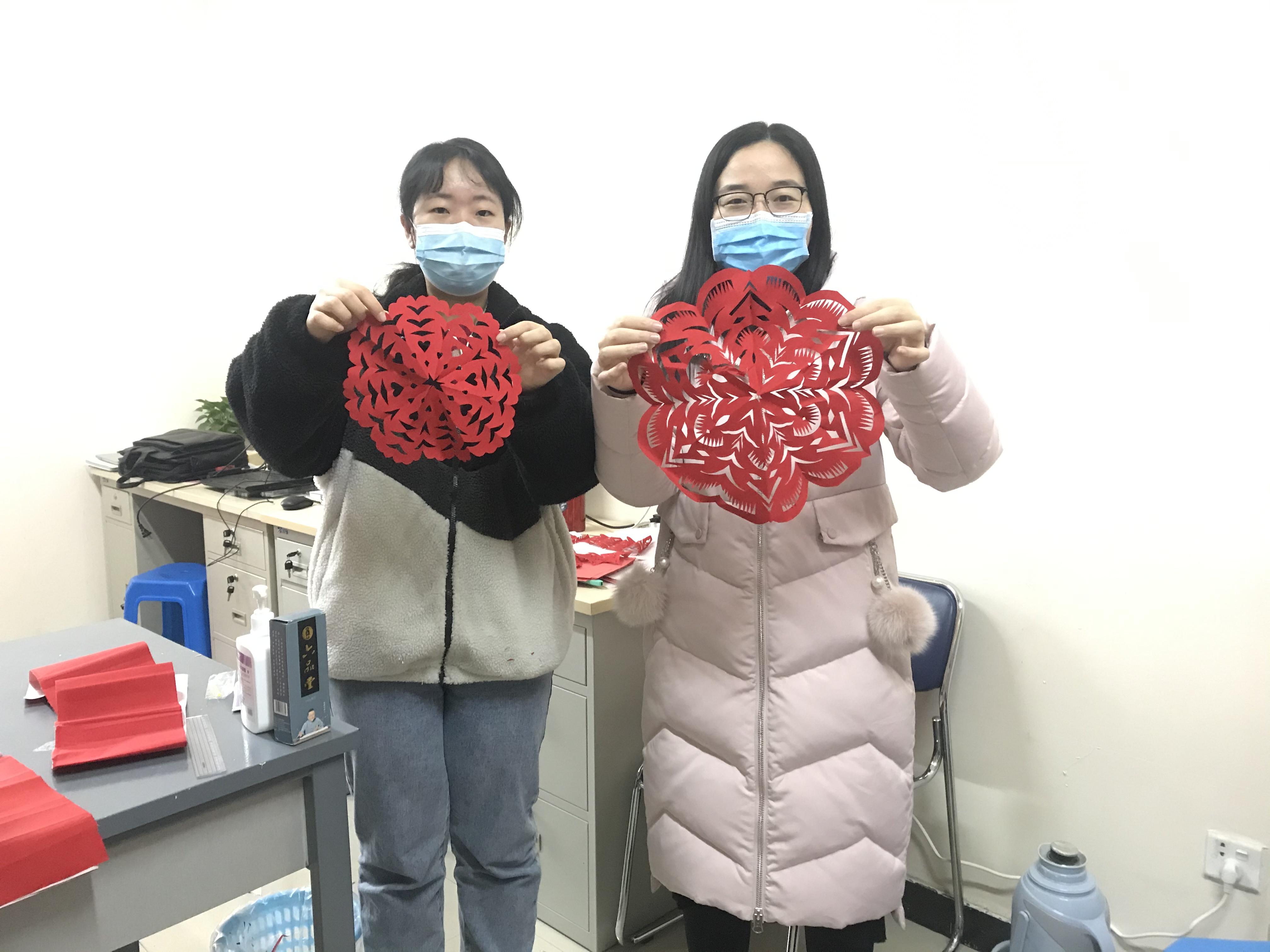 輔導(dǎo)員嚴(yán)青(右)和學(xué)生一起剪窗花慶祝元旦