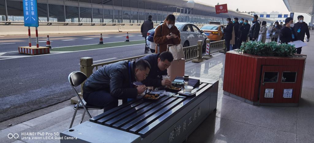 送一程,再送一程,在北客站出發(fā)平臺呼嘯的寒風中,校長李志健、化工學院黨委書記張巖、黨校辦副主任李述麟在路邊的長椅上吃完了冰冷的一餐。一輛陜科大的擺渡大巴剛到站,他們又放下盒飯,起來送又一批學子進站。
