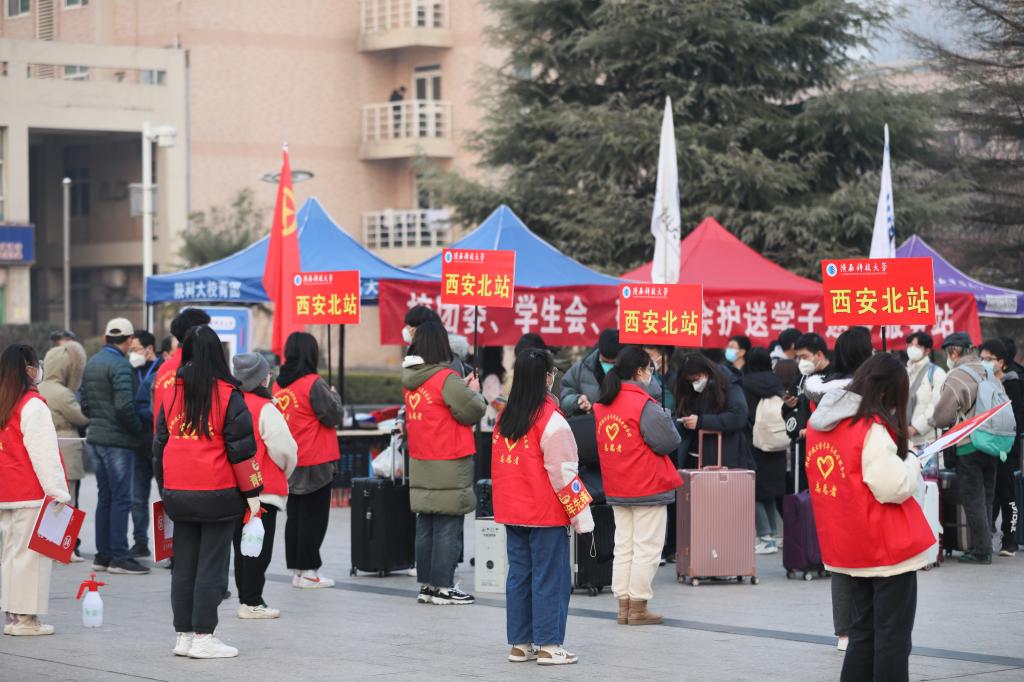 春運期間,為了確保“點對點”把學生送到家,訾榮祿、喬明哲、張巖3名二級學院黨委書記挺身而出,率領一批青年教師,分別堅守在西安南站、西安火車站、西安北站,和各站地勤人員對接聯(lián)絡,迎接學校擺渡車,把學子們安全送進候車廳,并解決行程中的突發(fā)狀況。