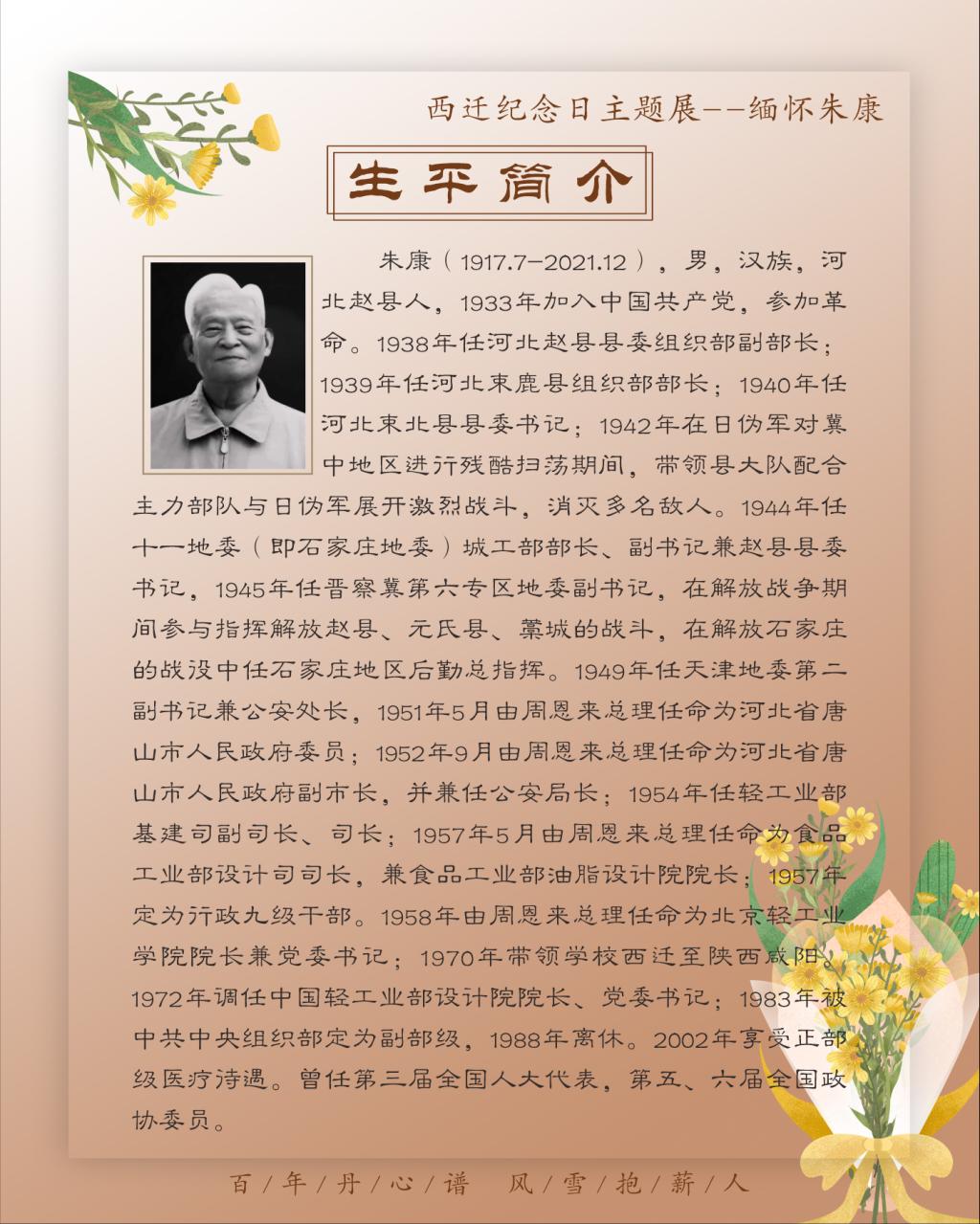 朱康是陜西科技大學(原西北輕工業(yè)學院)的首任院長兼黨委書記,組織領導了學校在北京的第一次創(chuàng)業(yè)和走向大西北的第一次搬遷,為學校的第二次創(chuàng)業(yè)奠定了基礎。朱康是中國共產(chǎn)黨的優(yōu)秀黨員、忠誠的共產(chǎn)主義戰(zhàn)士,他1933年參加革命,經(jīng)歷了新民主主義革命時期、社會主義革命和建設時期、改革開放和社會主義現(xiàn)代化建設新時期、中國特色社會主義新時代四個歷史時期。他的一生是經(jīng)歷百年奮斗與滄桑巨變的一生,他對黨忠誠、廉潔奉公、愛生如子,反映出共產(chǎn)黨人的高貴品質(zhì)。