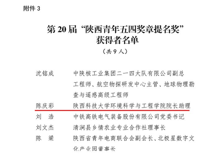 在建團(tuán)百年之際,為充分發(fā)揮青年典型模范帶頭作用,激勵(lì)全省廣大青年心懷“國(guó)之大者”,奮勇建功立業(yè),以優(yōu)異成績(jī)迎接黨的二十大勝利召開,共青團(tuán)陜西省委、陜西省青年聯(lián)合會(huì)授予70名同志“陜西青年五四獎(jiǎng)?wù)隆薄?5個(gè)青年集體“陜西青年五四獎(jiǎng)?wù)录w”、9名同志“陜西青年五四獎(jiǎng)?wù)绿崦?jiǎng)”、10個(gè)青年集體“陜西青年五四獎(jiǎng)?wù)录w提名獎(jiǎng)”,我校環(huán)境科學(xué)與工程學(xué)院青年教師陳慶彩榮獲第二十屆“陜西青年五四獎(jiǎng)?wù)绿崦?jiǎng)”。