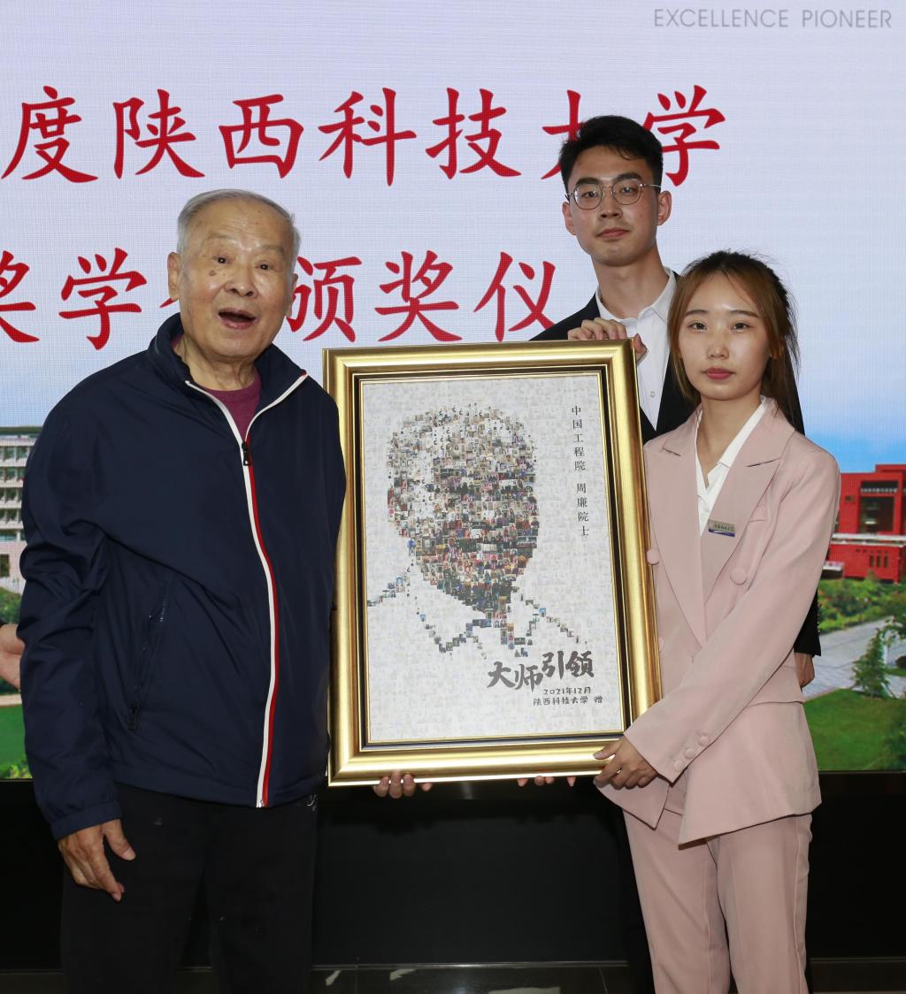 周廉院士為獲獎學生一一頒發(fā)證書,并與他們親切合影留念。同學們用歷年獲獎照片制作的肖像作為紀念品贈送給周廉院士,以此表達心中感激之情。