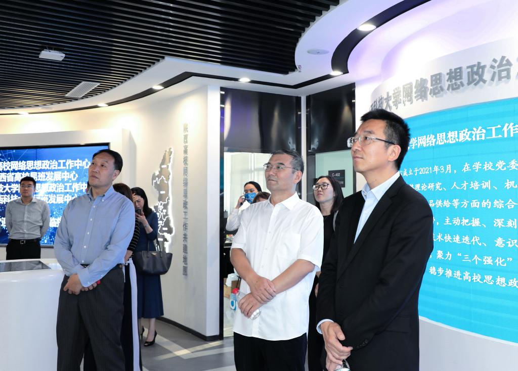 李志健、黃劍鋒陪同蒙震一行先后參觀考察了我校分析測(cè)試中心、圖書智慧管理系統(tǒng)、網(wǎng)絡(luò)思想政治工作中心、中心機(jī)房及智慧教室的建設(shè)與使用情況。在分析測(cè)試中心,蒙震一行參觀了各個(gè)重點(diǎn)實(shí)驗(yàn)室,詳細(xì)了解了各高精尖儀器設(shè)備的購(gòu)置背景和用途等情況。圖書館館長(zhǎng)王海剛向蒙震一行介紹了智慧圖書館平臺(tái)、大數(shù)據(jù)分析系統(tǒng)的建設(shè)情況,現(xiàn)場(chǎng)展示了實(shí)時(shí)的入館人數(shù)、借閱量、借閱排行等數(shù)據(jù)。在網(wǎng)絡(luò)思想政治工作中心,中心主任李萌詳細(xì)介紹了網(wǎng)絡(luò)文明研究中心、優(yōu)質(zhì)網(wǎng)絡(luò)文化精準(zhǔn)供給轉(zhuǎn)化中心、精準(zhǔn)賦能實(shí)踐中心和各個(gè)應(yīng)用學(xué)習(xí)平臺(tái)的建設(shè)情況。信息與網(wǎng)絡(luò)管理中心主任李健詳細(xì)介紹由中國(guó)銀行投資的設(shè)備及運(yùn)行情況。在阿爾斯特學(xué)院,蒙震一行參觀了PBL教室、計(jì)算機(jī)多用途教室、觀摩室等地,院長(zhǎng)薛朝華在研討型互動(dòng)教室向蒙震一行展示介紹了多屏互動(dòng)投屏系統(tǒng)。蒙震對(duì)我校盤活資金投入教學(xué)科研,改善辦學(xué)條件,提高數(shù)字化國(guó)際化辦學(xué)能力的建設(shè)成效予以高度贊譽(yù)。