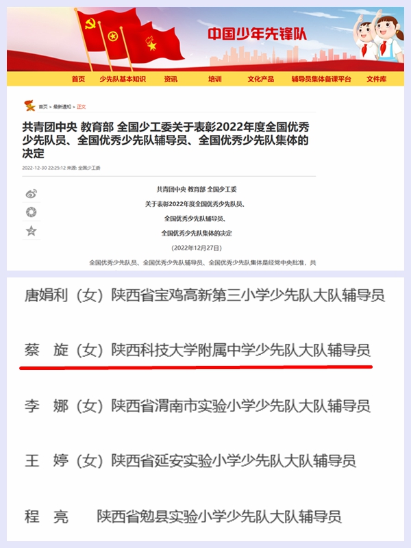 近日,共青團(tuán)中央、教育部、全國少工委公布了《關(guān)于表彰2022年度全國優(yōu)秀少先隊員、全國優(yōu)秀少先隊輔導(dǎo)員、全國優(yōu)秀少先隊集體的決定》,我校附屬中學(xué)少先隊大隊輔導(dǎo)員蔡旋被授予2022年度全國優(yōu)秀少先隊輔導(dǎo)員稱號。