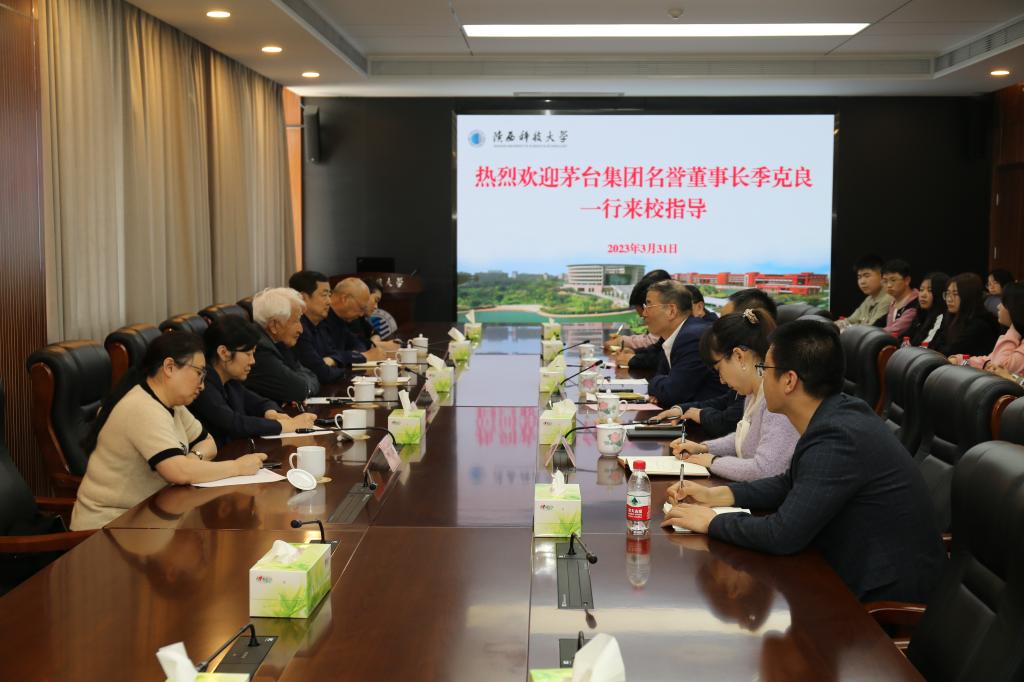 為積極推進(jìn)《陜西科技大學(xué)-貴州茅臺(tái)酒廠(集團(tuán))戰(zhàn)略合作框架協(xié)議》,3月31日,茅臺(tái)集團(tuán)名譽(yù)董事長季克良,我校校友、茅臺(tái)集團(tuán)有限責(zé)任公司副總經(jīng)理、總工程師王莉(食品90級(jí)),原副總經(jīng)理、總工程師呂云懷等茅臺(tái)集團(tuán)領(lǐng)導(dǎo),原陜西西鳳酒股份有限公司副董事長、總經(jīng)理賈智勇一行應(yīng)邀來校座談交流。校長李志健出席座談會(huì)并講話。校黨委副書記王道安出席座談會(huì)。