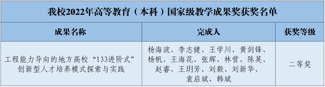 近日,教育部發(fā)布了《關(guān)于批準(zhǔn)2022年國家級(jí)教學(xué)成果獎(jiǎng)獲獎(jiǎng)項(xiàng)目的決定》(教師〔2023〕4號(hào)),我?!肮こ棠芰?dǎo)向的地方高?!?33進(jìn)階式’創(chuàng)新型人才培養(yǎng)模式探索與實(shí)踐”教學(xué)成果榮獲高等教育國家級(jí)教學(xué)成果二等獎(jiǎng),保持了學(xué)校連續(xù)兩屆獲得國家級(jí)教學(xué)成果二等獎(jiǎng)的記錄。截至目前,我校共獲得國家級(jí)教學(xué)成果獎(jiǎng)4項(xiàng)。