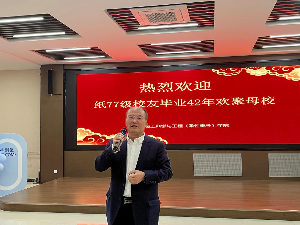 返校期間,校友們參觀了輕工科學(xué)與工程學(xué)院(柔性電子學(xué)院)造紙實(shí)驗(yàn)室。輕工學(xué)院黨委書記李新平代表學(xué)院熱烈歡迎紙77校友們回到母校,我校輕工科學(xué)與工程學(xué)科帶頭人、紙77校友張美云教授向校友們介紹了輕工學(xué)科和專業(yè)的歷史、現(xiàn)狀與近年來的發(fā)展。