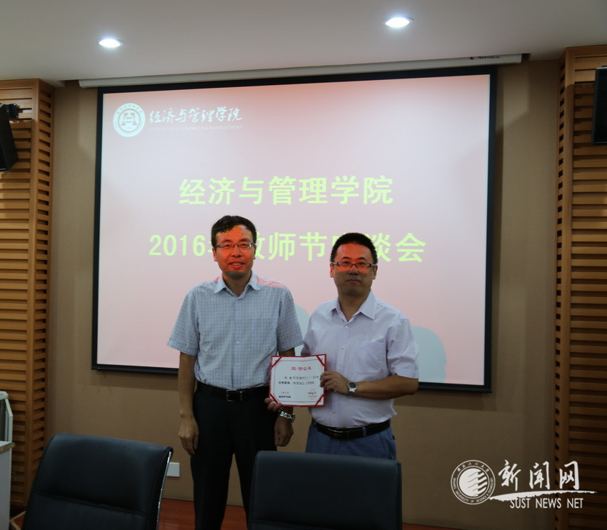 副校長郭霄鵬(左一)為經(jīng)管學(xué)院獲獎(jiǎng)教師頒發(fā)榮譽(yù)證書