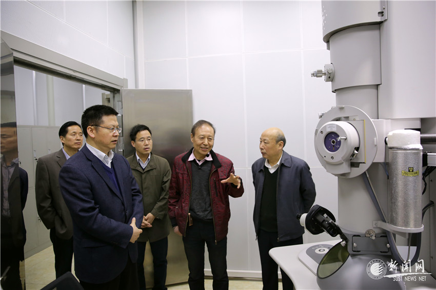 西安市副市長方光華(左一)一行在校黨委書記潘中偉(右一)等的陪同下參觀協(xié)同創(chuàng)新中心實驗室