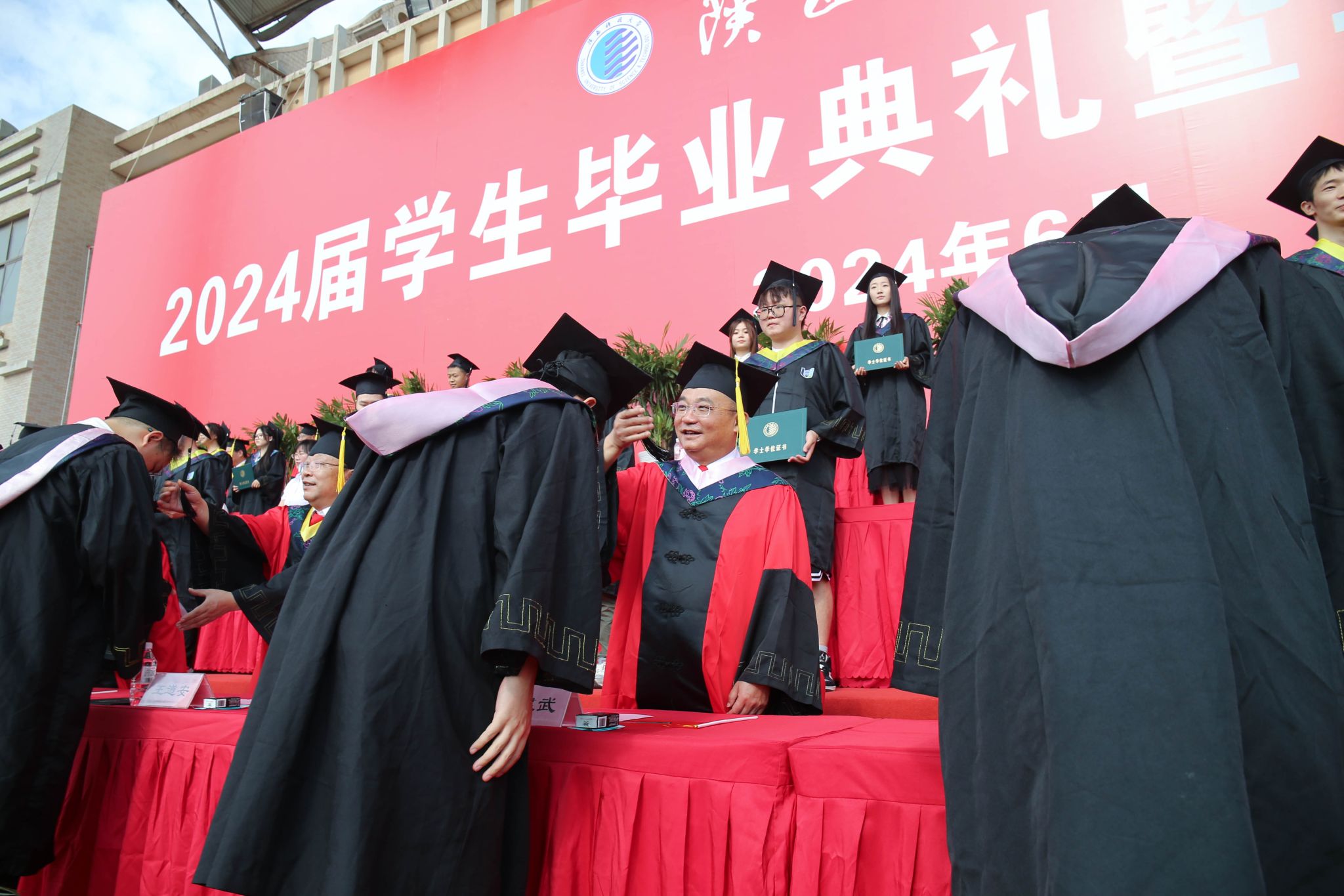 畢業(yè)典禮后,學(xué)校在文體館舉行了陜西科技大學(xué)2024屆碩士研究生學(xué)位授予儀式。校長李志健、副校長蒲永平為 1100余名博士研究生、碩士研究生一一撥穗、授證并合影留念。