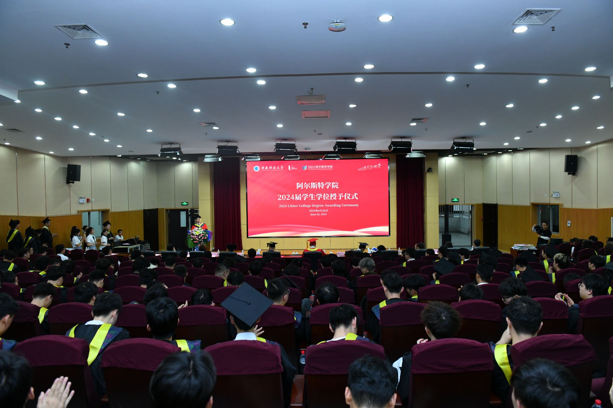 晴日暖風(fēng)生麥氣,綠陰幽草勝花時(shí)。6月26日下午,陜西科技大學(xué)阿爾斯特學(xué)院2024屆畢業(yè)生學(xué)位授予儀式在圖書(shū)館學(xué)術(shù)報(bào)告廳舉行。校長(zhǎng)李志健、阿爾斯特大學(xué)校長(zhǎng)Paul Bartholomew、副校長(zhǎng)蒲永平出席儀式,阿爾斯特大學(xué)計(jì)算機(jī)、工程與建筑環(huán)境學(xué)部副部長(zhǎng)Paul Hanna,我校國(guó)際合作與交流處、財(cái)務(wù)處、教務(wù)處等相關(guān)部門(mén)負(fù)責(zé)人,阿爾斯特學(xué)院領(lǐng)導(dǎo)班子成員、學(xué)院專(zhuān)業(yè)負(fù)責(zé)人、全體教職工、2024屆畢業(yè)生及家長(zhǎng)代表參加儀式。儀式由阿爾斯特學(xué)院常務(wù)副院長(zhǎng)薛朝華主持。