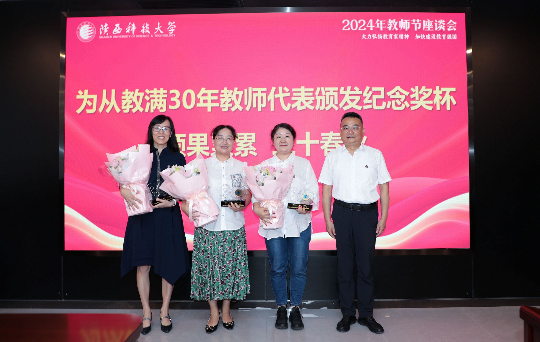 會上,校領導為從教滿10年、20年、30年教師代表頒發(fā)了紀念獎牌,送上了鮮花。來自各教學單位的15位一線教師代表圍繞會議主題先后發(fā)言。他們結合自己的教學、科研和學習經歷,深情講述了對教育事業(yè)的熱愛與執(zhí)著追求。