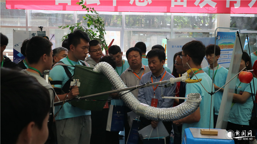 評(píng)委對(duì)我校作品“背負(fù)式蘋(píng)果輔助采摘裝置”進(jìn)行現(xiàn)場(chǎng)問(wèn)辯