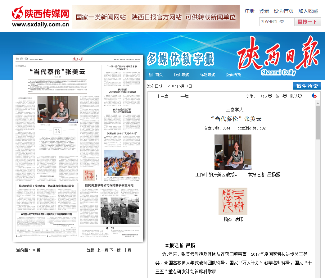 5月31日,《陜西日報》教育版以《三秦學人 “當代蔡倫”張美云》為題報道了我校張美云教授的教學科研事跡,全文轉(zhuǎn)載如下: