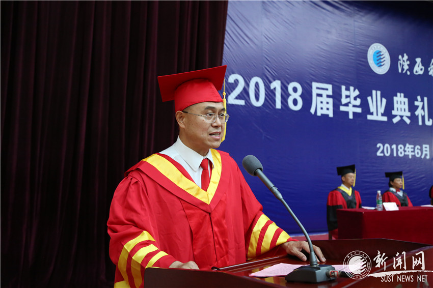 校長馬建中以《讓情懷激揚青春 用奮斗實現(xiàn)夢想》為題,為畢業(yè)生深情致辭。他代表學校,向同學們表示熱烈的祝賀和美好的祝福,向為同學們的成長傾注心血、付出辛勞的全體教職工和家長朋友們致以崇高的敬意。他回顧了全體陜科大人一步一個腳印,用勤勞和智慧取得的學校綜合實力和影響力大幅提升、開拓共享和諧新局面等發(fā)展成果。并為同學們在國家級“雙創(chuàng)”競賽、體育賽事中取得的優(yōu)異成績,為同學們在畢業(yè)后通過自主創(chuàng)業(yè)、光榮參軍、繼續(xù)深造、奔赴工作崗位等多種形式追求夢想、擔負家國責任感到欣慰和自豪。