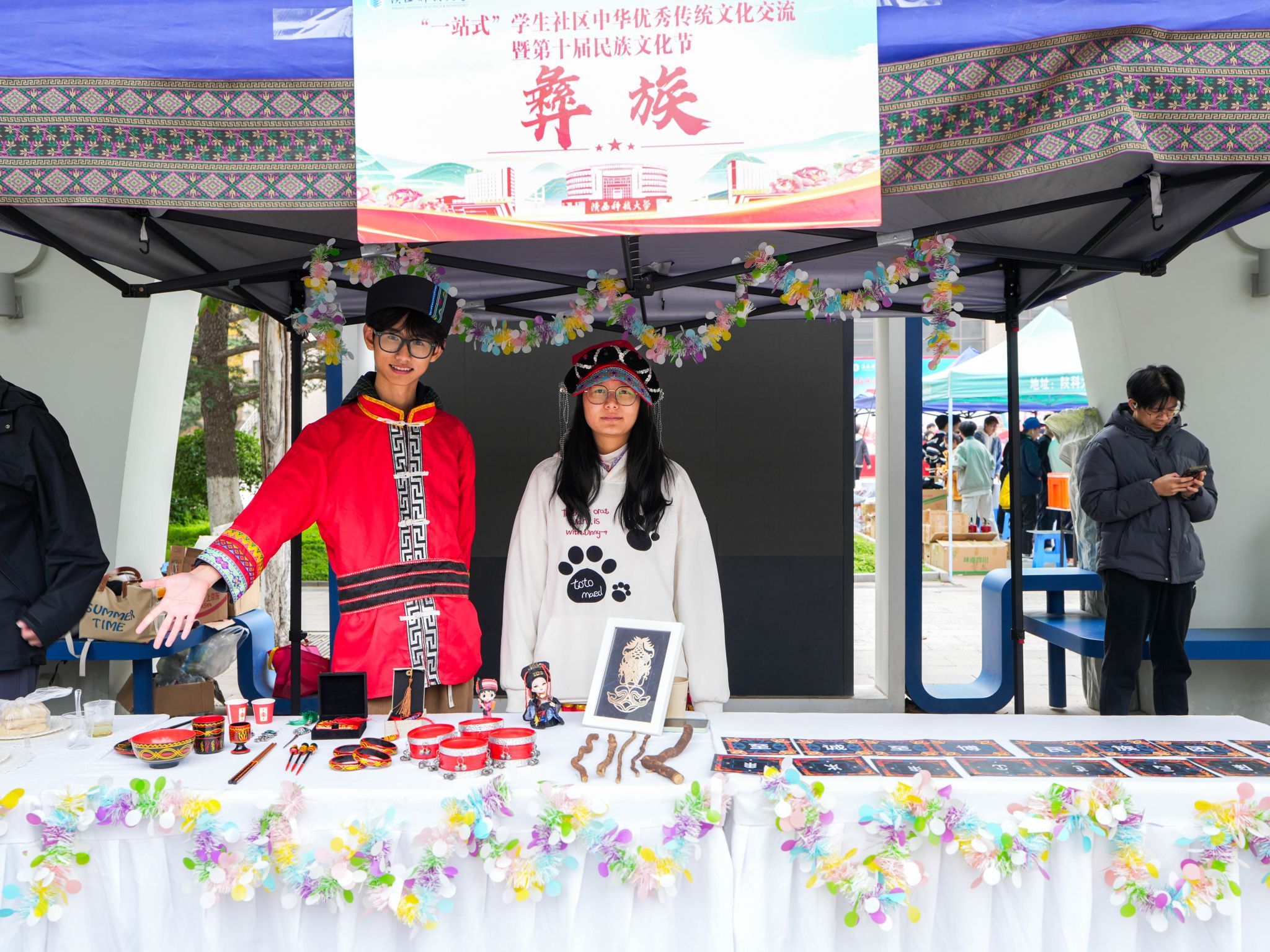 活動現(xiàn)場,在文化長廊區(qū)域,師生們沉浸式體驗了多姿多彩的民族風(fēng)情。現(xiàn)場設(shè)有民族美食品嘗區(qū),提供維吾爾族手抓飯、藏族風(fēng)干牦牛肉、蒙古族鮮奶鍋巴等特色食品;同時設(shè)置投壺、拋繡球等傳統(tǒng)游戲互動環(huán)節(jié),以及民族服飾試穿、民族文化知識問答等內(nèi)容,讓參與師生在輕松氛圍中增進對不同民族文化的了解和認同。