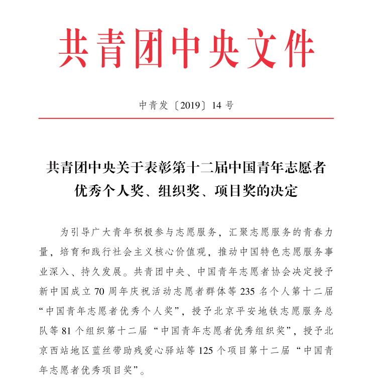 中國青年志愿者優(yōu)秀個人獎、組織獎、項目獎是由共青團中央、中國青年志愿者協(xié)會授予的我國青年志愿服務領(lǐng)域的最高榮譽。該獎項于1996年開始組織實施,每2年評選1次,至今已評選過十二屆,旨在選樹青年志愿服務優(yōu)秀典型,展示、推介全團青年志愿者工作重點品牌項目,推進青年志愿服務文化建設,推動青年志愿服務形成社會功能,促進青年志愿者行動深入、持久和創(chuàng)新開展。
