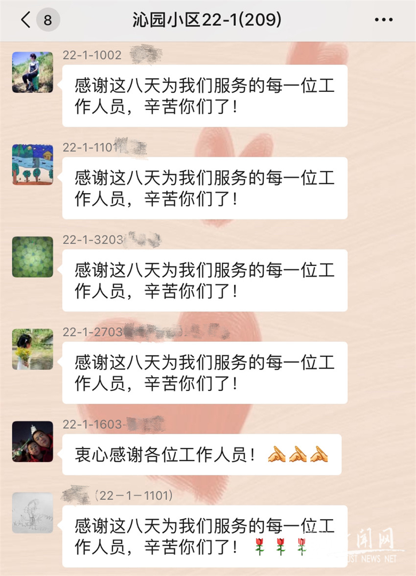 當(dāng)然,解除隔離讓我們終于可以自己取快遞、自己買菜了,終于不用再給那些為我們?nèi)找贡济Φ墓ぷ魅藛T繼續(xù)添麻煩了?!案兄x為我們服務(wù)的每一位工作人員,辛苦你們了!”大家用整齊的感謝話語(yǔ)刷滿了我們22號(hào)樓1單元的居民微信群。