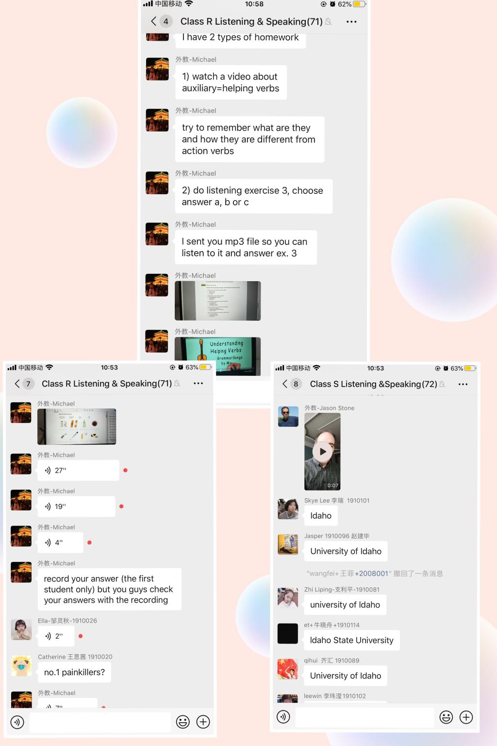 3月2日,首次線上課程由4名外籍教師承擔(dān),他們分別來自美國、加拿大、波蘭,其中兩個老師在國外克服時差進(jìn)行線上教學(xué)工作。北京時間8:00,外籍教師Jason和Michael準(zhǔn)時坐在電腦前,面對手機直播鏡頭開始了第一次線上課程。在微信群中,學(xué)生們踴躍發(fā)言,積極回應(yīng),Michal通過語音加視頻的方式進(jìn)行著課程教學(xué),而Jason嘗試用視頻加文字的方式為學(xué)生們授課。兩個小時的線上課程結(jié)束后,外教們還為學(xué)生們布置了課后作業(yè)。