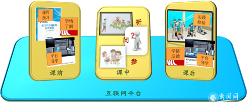 無論是教還是學(xué),在校學(xué)生的在線課程教學(xué),都應(yīng)該是線上與線下的結(jié)合,是建立在“互聯(lián)網(wǎng)+”之上的、多種教學(xué)手段合理運(yùn)用的混合式教學(xué),如下圖所示: